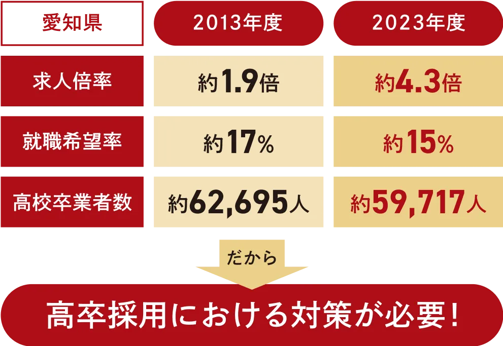 ※出典:愛知労働局「新規高等学校卒業予定者の職業紹介等状況(令和6年8月末現在/平成25年3月末現在)」。 愛知県「令和5年度 学校基本統計確定値 学校基本調査結果(愛知県分)」。愛知県 「平成25年度 愛知の教育統計(学校基本調査結果を中心に)」
